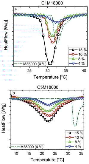 Secondly, C1M18000 has sharp and narrow transitions for all solutions with regard to the endotherms associated with C5M18000. Furthermore, C1M18000 seems to show a better thermal sensitivity [10] than C5M18000 as endotherms in Figure 3 show. Higher hydrophobic interactions could promote longer transitions when the DMA content is increased, i.e., lower thermal sensitivity such as C5M18000 endotherms displayed (Figure 3b). Generally, the LCST transition defines the temperature where the hydrogen bonds are breaking [37] as C1M18000 endotherms clearly show (Figure 3a). Nevertheless, C5M18000 displays another effect during the LCST transition, i.e., hydrophobic DMA could partially slow down the LCST leading to wider transitions where LCST occurs.