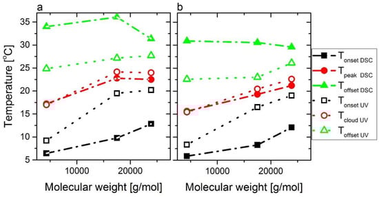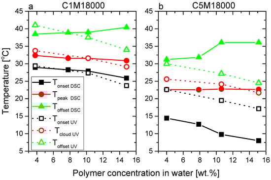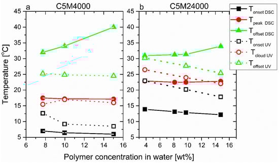 The LCST transitions were studied in detail through the estimation of onset, peak, and offset temperatures (TpeakDSC, TonsetDSC, and ToffsetDSC, analogously to Figure 5) of calorimetric curves for C5M4000 and C5M24000 solutions with different concentrations. Furthermore, some onset, cloud, and offset points (TcloudUV, TonsetUV, and ToffsetUV) obtained from transmittance data were included and an excellent correspondence between LCSTs can be observed. In this way, both peak temperatures (TpeakDSC) and cloud points (TcloudUV) exhibit similar values for C5M4000 (Figure 9a) and C5M24000 (Figure 9b).