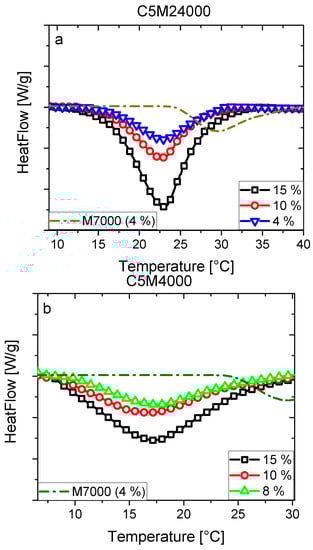 C5M24000 and C5M18000 endotherms (Figure 3b and Figure 8a) showed higher LCSTs than C5M4000 (Figure 8b) due to a molecular weight increase, leading to a lower hydrophobicity difference as previously discussed by us for PNIPAM [11], because end-groups are reduced and consequently hydrophobic interactions. The M7000 homopolymer exhibited the highest LCST showing the strong effect of the DMA content in C5M24000, C5M18000, and C5M4000. This effect was slightly perceived for the differences between LCSTs of C5M24000 and C5M18000, but the changes between DMA content made difficult extracting conclusions. However, it should also be mentioned that, while the comonomer contents were similar, they were slightly different. In the next section, we will discuss these effects in detail.