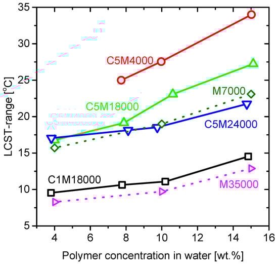 Figure 12 shows the diverse LCST ranges estimated from the different endotherms (Figure 3 and Figure 8) for all the samples and were displayed as a function of polymer concentration in water. The LCST ranges changed in respect of the polymer concentration in water. This effect could be ascribed to the coil-to-globule transition, as less concentrated solutions tend to aggregate and settle easier. On the other hand, a lower percentage of the dissolved polymer could lead to increase the transition temperature at higher polymer concentration. Moreover, the LCST range dependence on concentration of the sample seemed to be connected to the LCST range at high concentrations. When extrapolating the data to zero concentration, the LCST range for all samples appeared to be around 10 °C, suggesting that this was the minimum width observable for the LCST. As C5M4000 had the broadest LCST, it also showed the highest slope regarding to other samples in relation to great hydrophobic interactions and the polymer concentration in water.