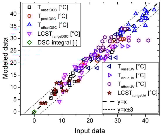 In order to visualize the quality of the fits, Figure 13 shows a comparison between input data and the modeled prediction. The thick dashed line represents an ideal correlation, while the thin dashed lines indicate a deviation by ±3, which encompasses almost all results. The r² value of all data in Figure 13 was found to be 0.95598, suggesting all data can be modeled well. Furthermore, it becomes obvious that the correlations for the DSC derived quantities were more precise, especially for the Tpeak. This can be explained from firstly, the cleaner calorimetric signal, especially for the peak, and secondly from the much higher data density of calorimetry with ca. 100 data per K, while only ca. 1 point could be measured per K for UV-vis spectroscopy.
