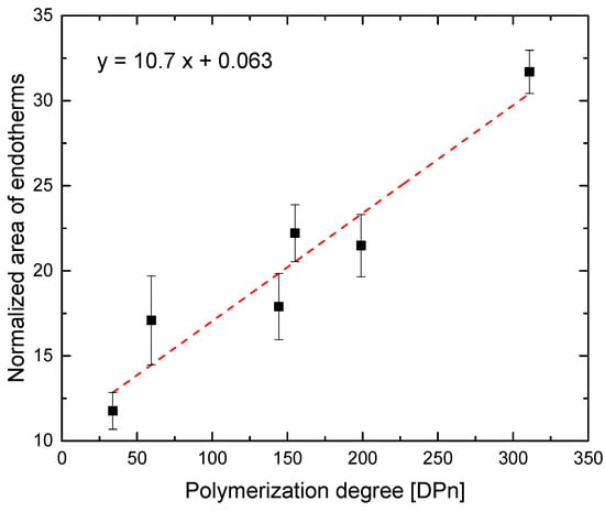 Another statistical study was also performed using the areas obtained from the endotherms of DSC studies (Figure 14), which were previously normalized to the polymer concentration in water and averaged by concentration. A clear linear regression can be observed from these results, where the error bars were estimated through the comparison between experimental data and regression model. The results clearly exhibited a dependence between polymerization degree and the area of the endotherms, as those could be associated with the number of hydrogens involved in the LCST [21]. Obviously, the comonomer content will not affect the final trend so much, because the number of comonomer units along the polymeric branches was rather low, as all the samples present DMA contents below 6%.