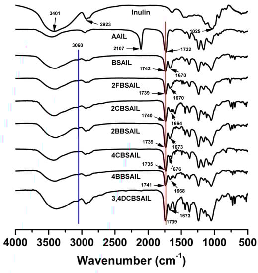 The structures of inulin and inulin derivatives were characterized by FTIR (Figure 1), 1H NMR (Figure 2), and 13C NMR (Figure 3) spectroscopy. As shown in Figure 1, the characteristic absorption peaks of saccharide were located at 3401 (O–H stretching), 2923 (–CH2 stretching), and 1025 cm−1 (C–O–C bending) [37]. In the IR spectrum of AAIL, there were distinct peaks at 2107 and 1734 cm−1 that belonged to the azido and acetyl, respectively [37]. Regarding inulin derivatives, compared with AAIL, the absorption of acetyl (1734 cm−1) still existed, but the absorption of azido (2107 cm−1) disappeared completely. Instead, there were new peaks at about 1670 cm−1, which belonged to the imine. Moreover, there were no absorptions of aromatic aldehydes (1700 cm−1) found in inulin derivatives, which indicated that these derivatives were well purified [35,41]. Besides, at 3060 and 1450–1600 cm−1, there appeared the characteristic absorption of the benzene ring. At the fingerprint region, absorptions at 754, 727, and 693 cm−1 were also evidence of the benzene conjunction [35].