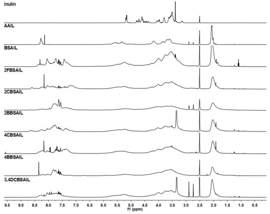 1H NMR (Figure 2) and 13C NMR (Figure 3) were useful for further characterizing the structure of inulin, AAIL, BSAIL, 2FBSAIL, 2CBSAIL, 2BBSAIL, 4CBSAIL, 4BBSAIL, and 3,4DCBSAIL. The signals of the inulin skeleton, including the anhydroglucose unit, appeared at δ 3.00–5.40 ppm in 1H NMR and δ 60–103 ppm in 13C NMR [37], which always existed for every inulin derivative. After azide substitution, for the 1H NMR of AAIL compared to inulin, new signals appearing at δ 3.69 and δ 2.03 ppm were assigned to the H–C6–N and the hydrogen of the acetyl (Ac), respectively. Similarly, for the 13C NMR of AAIL, signals at δ 52.58 and δ 170.28 ppm were attributed to the C6-N and C=O of the acetyl (Ac), respectively. After further reaction, in the 13C NMR spectrum of inulin derivatives, the signals of C6-N moved to δ 63 ppm. Additionally, signals at about δ 164 ppm were assigned to the N=C7. Meanwhile, new chemical shifts appearing in the range of δ 120–140 ppm contributed to the aromatic carbons of the benzene ring. In the 1H NMR spectrum of inulin and inulin derivatives, signals appearing at about δ 8.05 ppm were assigned to the H–C7=N. Signals in the range of 7.00–8.60 ppm were assigned to the aromatic hydrogens of the benzene ring [35].