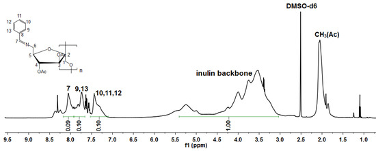 The DS for inulin derivatives was calculated by the ratio of the integral values of protons H7-13 to that of inulin backbone protons (H1-6/6′) [35,42,43,44]. For example, the DSimine value of BSAIL was calculated according to Equation (2) by 1H NMR (Figure 4). The results are summarized in Table 1.