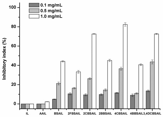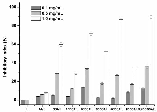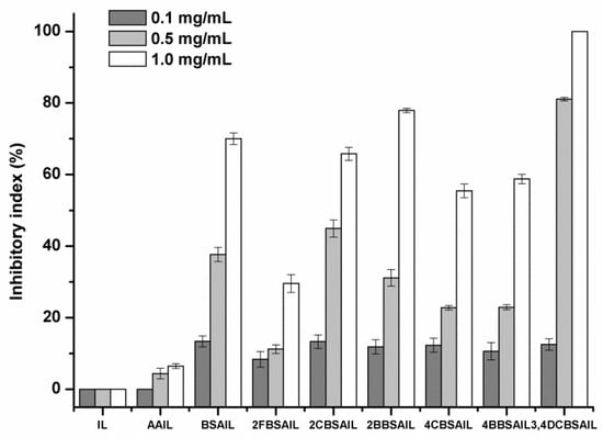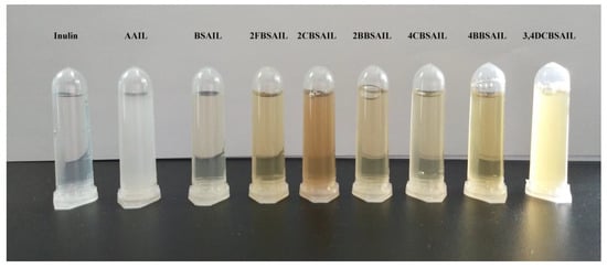 Figure 5 shows the aqueous solutions of samples at 1.0 mg/mL, room temperature. Except AAIL and 3,4DCBSAIL, all samples showed favorable water solubility and their solutions were prepared at a concentration of 0.1–1.0 mg/mL. For AAIL and 3,4DCBSAIL, considering that they are homodisperse in deionized water, their antifungal activity was tested together with other samples.