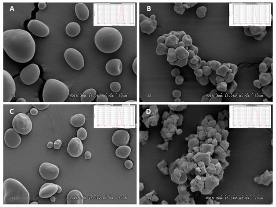SEM micrographs of (A) potato starch (1000×), (B) corn starch (1000×), (C) wheat starch (500×), and (D) rice starch (2000×). Different magnifications were used for a clearer observation of the granules. The particle size distribution profiles, as measured by laser diffraction, are given for each starch.