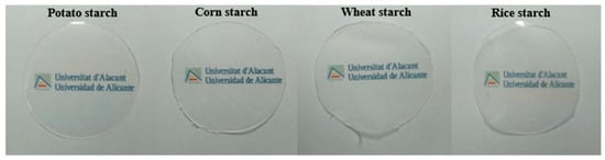 The amylose content of the starches was similar for all the starches although with slight differences. These differences could have certain influence on the different properties obtained for the films, as it will be discussed later. In order, the amylose content of the starches was the following: rice (16.9%) < potato (20.5%) < wheat (24.5%) ≈ corn (24.8%). The literature reports considerable discrepancies in the amylose content of starches, mainly due to the exact botanical origin of each starch and the determination method. Nevertheless, the amylose content of the starches we recorded and the values presented in the literature were in good agreement [9,17,18,19].
