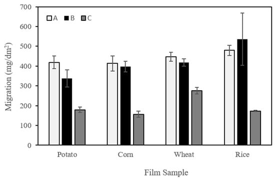 Overall migration values into different food simulants. (A) Ethanol (10% v/v), (B) acetic acid (3% w/v), and (C) isooctane.