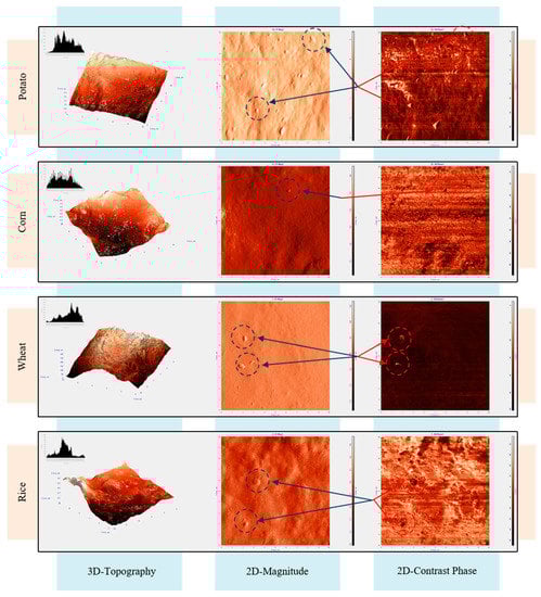 AFM three- and bi-dimensional topographic images and bi-dimensional contrast phase images of the surface of potato, corn, wheat, and rice films.