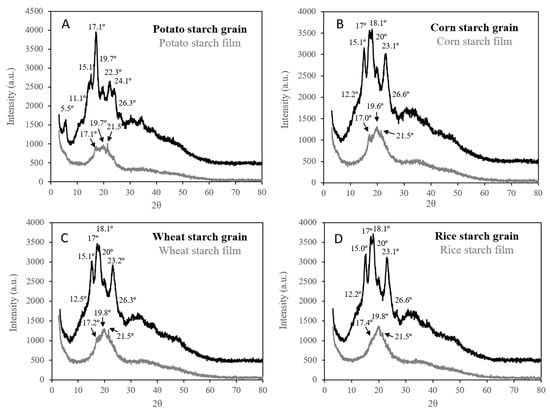 In the case of the potato starch film (the only one obtained from a tuber), the films presented an intermediate crystalline structure between rice starch films and those made from corn and wheat starch with undefined broad peaks. This is probably due to potato starch having an intermediate molecular weight and amylose content. In addition, as it was previously mentioned, potato starch contains the highest percent of phosphate monoesters. This could also contribute to the more amorphous nature of potato starch films compared to corn and wheat starch films. Phosphate monoesters are charged groups, which can hinder the starch rearrangement during starch film preparation reducing the ordered or crystal structures of potato starch films. This corroborates the mechanical properties observed for the potato starch films, which are less resistant and more stretchable than corn and wheat starch films, and more resistant and less extensible than rice starch films.