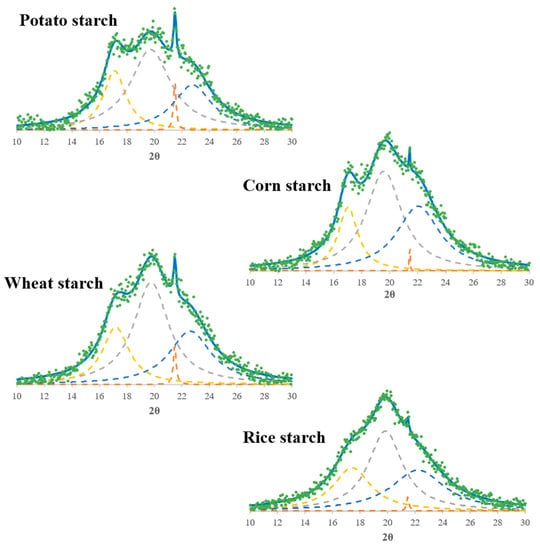 Deconvoluted XRD peaks of starch films obtained from potato, corn, wheat, and rice starch using the Lorentz function.