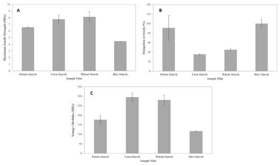 Mechanical properties of the starch films studied. (A) Maximum tensile strength; (B) elongation at break; and (C) Young’s modulus.
