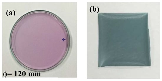Interestingly, the color of the resultant film changed from pink-magenta as a wet hydrogel (Figure 2a), to sea-green as a dried cast film (Figure 2b). It is surmised that color changes during the oven-drying process are mainly the result of the pH change in the hydrogel owing to the gradual evaporation of water from the PVA/CS/ATH/STPP hydrogel, in which both sodium hydroxide and acetic acid existed simultaneously in the gel.