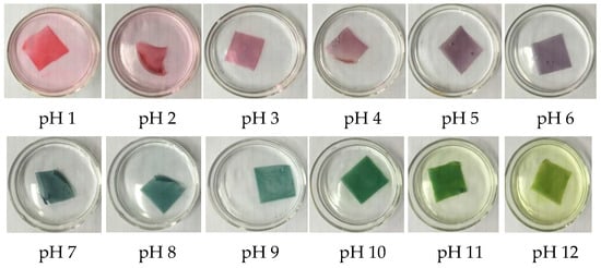 The coloration of the cast pH indicative films submerged in buffer solutions with pH values from 1 to 12 is shown in Figure 3. These films were sensitive to the pH values of the solutions. Commonly, the color change on these pH indicative films occurred very quickly, in usually less than 30s. The coloration of these films could be attributable to the transformation in the chemical structure of ATH molecules with respect to the pH values of the solution [5,14,26]. At pH 1, this film shows a reddish color, and markedly changes its color from reddish to purple as the pH is increased to 6. It is blue at pH 7 and 8, but changes to sea green at pH 9. With an increase of pH to 12, this film becomes yellow-green fast. The vivid color changes of the prepared films against the pH values have enabled their applications as pH indicators in food packaging, and this will be demonstrated in the latter part of this report.