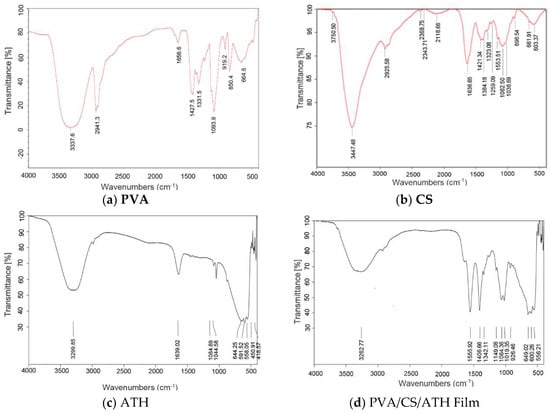The FT-IR spectra of PVA, CS, ATH and the PVA/CS/ATH film are shown in Figure 4. The film examined was synthesized from the ATH-containing hydrogel with a volume ratio of PVA/CS=35/65. On the FT-IR spectrum of PVA, peaks corresponding to 3337.6 cm−1 and 1427.5 cm−1 are attributed to the stretching and the bending vibrations of –OH group, while the bands at 1331.5 cm−1 and 2941.3 cm−1 are the result of –CH2 stretching vibrations. The peak appearing at 1656.6 cm−1 arises from the crystallized water molecules in the polymer. The bands from 919.2 to 1093.9 cm−1 feature the oscillations of the C–O–H group [12,28]. For pure chitosan (CS), the absorption at 3447.48 cm−1 corresponds to the stretching –OH group, and the band at 2925.58 cm−1 is one characteristic of the –CH2 group bonded to –OH. The peak at 1636.65 cm−1 is attributed to C–O stretching of the acetyl group (amide I). Furthermore, the peak at 1421.34 cm−1 is the bending vibration of the –C–OH group, while that of 1384.18 cm−1 is the result of the knife in the plane of the –OH group. The regions from 1153.51 to 1038.69 cm−1 are the characteristics of the symmetric oscillation of the C–O–C group [14,28]. As for the FT-IR spectrum of anthocyanin, the uptake at 3299.85 cm−1 relates to the –OH group, and the peak at 1639.02 cm−1 represents the C=C aromatic ring, bands from 1044.58 to 1084.89 cm−1 arise from the oscillations of the C–O–C group [14].