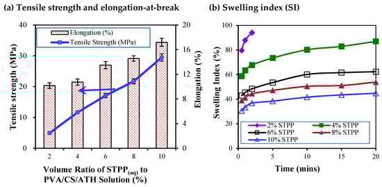 PVA/CS hydrogels have recently been extensively studied for their potential applications, e.g., in biomedical applications and biomaterials [13,16]. Chitosan is a kind of natural polymer, derived from sustainable resources [8]. Owing to the polysaccharide nature of chitosan, the percent elongation-at-break decreases significantly with an increasing CS content in hydrogels [13]. Therefore, addition of biodegradable and flexible PVA to CS becomes an alternative for the cast films. Stefani et al. [14] studied the PVA/CS/ATH film as a time-temperature indicator. In their work, the composition of CS and PVA in the cast film was not varied but, instead, maintained constant at 70/30 along with a constant dose of STPP [14]. It is known that the crosslinker could influence the structural strength of the hydrogel and the resultant films. Hence, the effect of STPP dosage on the mechanical properties of the resultant PVA/CS/ATH films was studied in this work (Figure 6a). Similarly, Figure 6b shows the effect of STPP dosage on the time-dependent swelling of the cast films. Notably, the results shown in Figure 6 were obtained from experiments with PVA/CS at 25/75. In general, the tensile strength and the percent elongation-at-break increased with an increasing amount of STPP added to the hydrogels. Similarly, the swelling ratio of the cast films was significantly suppressed with more STPP initially present in the hydrogel.