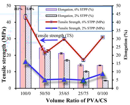 As aforementioned, the aim of this work is to explore how to use more sustainable components, e.g, chitosan (CS), in packaging films. Accordingly, the effect of the CS dosage in the PVA/CS mixed solutions on the resultant pH indicative films was studied. The mechanical properties of the pH indicative films with 2% and 6% STPP, including the ultimate tensile strength (TS), the elongation-at-break and the swelling index, are summarized in Figure 7.
