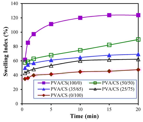 As shown in Figure 6b, films cast with 2% STPP swelled quickly. Hence, only films cast with 6% STPP proceeded to the swelling test. The absorption amount of water by pH indicative films varied and was dependent on the mixed volume ratios of PVA/CS in the films. In general, the adsorption kinetics of water by these films grows exponentially with more submersion time. Moreover, an increasing CS content in indicative film results in a smaller swelling index at the same submersion time (Figure 8). For example, more water was imbibed into the PVA film than others, as reflected in the relatively larger SI values of PVA films ranging from 61.5% to 123.7%. This can be attributed to the hydrophilic nature of PVA polymer. The lowest SI values were found around 34.8% to 47.7% on the films containing chitosan only. The SI values of PVA/CS indicative films are generally larger when more PVA is present in the mixed hydrogels of PVA/CS. For example, the SI values of PVA/CS film with a mixed PVA/CS ratio of 25/75 for hydrogel increase from 43% at 0.5 min to 62.3% at 20 min, while the SI values of films cast from the hydrogel (PVA/CS = 35/65) increase from 50.1% at 0.5 min to 69.2% at 20 min. That is, the water absorptivity of PVA/CS films increases with increasing PVA content in hydrogels. Generally, the as-synthesized PVA/CS films could absorb water quickly and possessed good tensile strength. Taking the mechanical properties into account, the film cast from the mixed hydrogel of PVA/CS = 35/65 is deemed as suitable for a pH indicative food-packaging application since the food quality could be visually observed by the color change of the PVA/CS films.