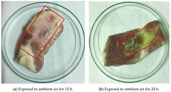The cast PVA/CS/ATH pH indicative films were applied to partially wrap pork belly slices, which were covered with Petri dishes and exposed to ambient air for 12 h and 24h. The covered portions by films are highlighted and enclosed in the red rectangles on Figure 9, whereas the rest were exposed to air. The partially wrapped meat was intentionally spoiled in the ambient conditions to observe the successive color change of the pH indicative films during the spoilage of the meat.