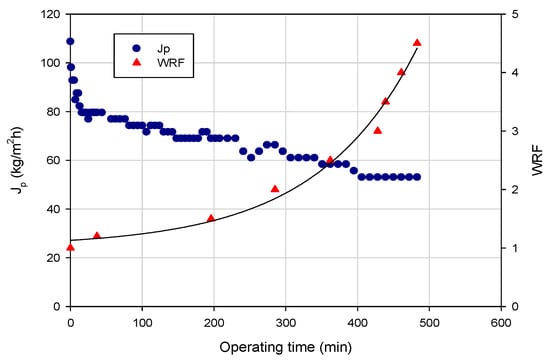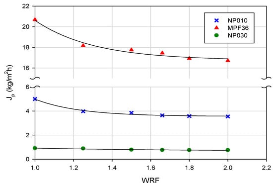 The clarified extract was processed with three different membranes. The evolution of permeate flux as a function of WRF at an operating pressure of 20 bar for the selected membranes is reported in