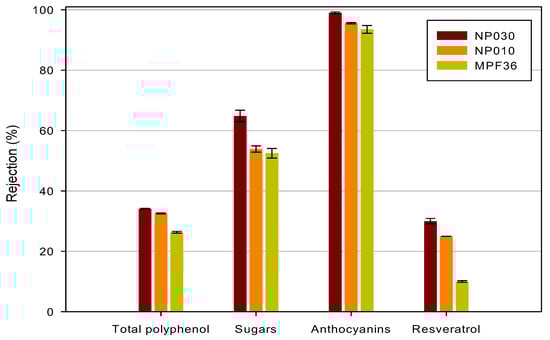 According to rejection data, the investigated membranes did not show a preferential rejection of phenolic compounds over sugars. Similar results were found by Diaz-Reinoso et al. [