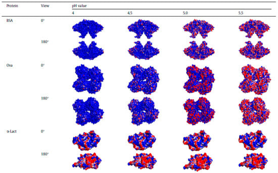 Simulations of surface charge distribution of bovine serum albumin (BSA), ovalbumin (Ova) and α-Lactoglobulin (α-Lact) at different pH with positively charged surfaces in blue, negatively charged surfaces in red, and neutral in white. Adapted with permission from Ref. []. Copyright 2015 Elsevier Ltd. All rights reserved.