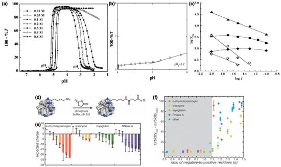 Various reports on the phase behaviors of protein–PE complexes have employed turbidimetry, notwithstanding the inherent empirical nature of the technique [,,,,]. The highest turbidity is observed upon the aggregation and subsequent phase separation of the complexes. Thus, as expected, changes in turbidity occur on varying the pH of the solution as it influences both the protein surface charge and the PE degree of ionization, which in turn affect the complexation of the protein–PE pair as well as the aggregation of the complexes. Near-neutrality of the soluble complexes is required to induce aggregation and solution turbidity, and thus turbidimetry only reveals complexation windows wherein the complexes aggregate []. It should be noted that, in some special cases, aggregation of charged soluble complexes can be achieved due to the “inter-complex or intra-complex disproportionation” of charge as suggested by Zhang and Shklovskii [,].