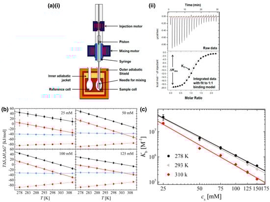 (a) (i) schematic of an isothermal titration calorimeter and (ii) results and analysis from a representative experiment. One reactant is injected at regular intervals of time into the sample cell holding the other reactant, and the energy required to maintain the sample cell at a constant temperature is measured as shown in (ii). The raw data are integrated and fit to a model to give the binding isotherm from which the binding enthalpy ΔHobs and the binding affinity KD are obtained. Reprinted with permission from Ref. []. Copyright 2015, American Chemical Society; (b) entropic (, black) and binding enthalpy (, red) contributions to total free energy (, blue) at different salt concentration, along with the calorimetric enthalpy (, dashed red) for the lysozyme- dendritic polyglycerol sulfate (dPGS) system. has contributions from enthalpy changes due ionization of buffer and of the ligand and changes in conformation; (c) dependence of binding constant (Kb) on salt concentration for the lysozyme-dPGS system. (b) and (c) are adapted and reprinted with permission from Ref. []. Copyright 2018, American Chemical Society, respectively.