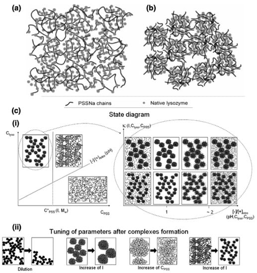 The structure of protein–PE complexes has been investigated using several techniques such as small angle neutron scattering (SANS) [,,,,,,], dynamic light scattering (DLS) [] and rheology [,]. Deuterium labelling of the PE chains has been employed to probe PE structure in lysozyme–NaPSS complexes using SANS measurements [,]. The scattering length densities (SLD) of unlabeled NaPSS and lysozyme are nearly equal. Therefore, in a solvent with a similar SLD, only the scattering from the deuterium labelled NaPSS (d-NaPSS) was detected, which allowed the lysozyme–NaPSS system to be studied in great detail. The conformation of individual NaPSS chains in the complex as well as the inter-chain interactions were quantified by varying the concentration of the deuterium labelled NaPSS chains []. Two regimes with distinct structures and macroscopic properties for the lysozyme-NaPSS complexes have been identified from SANS experiments. These constitute a semi-dilute gel-like regime with a mesh structure in which the lysozyme globules act as nodes interconnecting different PSS chains (Figure 5a) and a liquid-like dilute regime comprising densely packed spherical aggregates or globules of lysozyme and PSS chains (Figure 5b) []. A transition from the globular to the gel-like structure was observed upon increasing the PSS chain lengths from short chains (degree of polymerization N = 90) to long chains (N = 625) []. A similar transition was also observed with increasing NaPSS concentration (N = 800) at a constant ionic strength and protein concentration, or upon decreasing the ionic strength at constant NaPSS and protein concentration []. This transition from a globular to a gel-like structure was argued to be similar to the transition of a pure PE in solution from the dilute to the semi-dilute regime, which is observed at the critical concentration for chain overlap and is dependent on the size of the PE chains. The protein globules were envisaged as macroions that affect the electrostatic persistence length of PEs, leading to a decrease in chain dimensions and thereby increasing the critical overlap concentration. The extent to which the electrostatic persistence length and hence the critical overlap concentration of PE chains are affected depend on the strength of interaction of the protein–PE complex. It should be noted that the PE chain sizes may not be affected in case when protein–PE interactions are not significant []. Cousin et al. also reported the unfolding of lysozyme at large excess of NaPSS []. These results are summarized in Figure 5c(i) [].