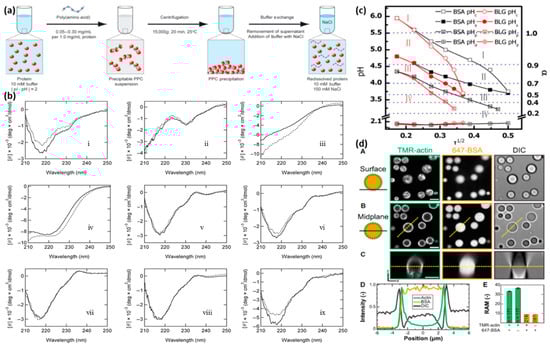 (a) schematic representation of concentration of proteins by precipitation and redissolution using poly(amino acid); (b) Far-UVCD spectra of i. panitumumab, ii. etanercept , iii. thyroglobulin, iv. L-asparaginase, v. adalimumab, vi. infliximab, vii. rituximab, viii. omalizumab and ix. IgG of native proteins (solid lines) and redissolved proteins (dotted lines) (a) and (b) are reprinted with permission from Ref. []. Copyright 2014 Wiley Periodicals, Inc. and the American Pharmacists Association; (c) phase boundaries of BSA and BLG with HA and the degree of ionization HA, α. pHc, pHϕ, pHp and pHd are the pH values of soluble complex, phase transition, precipitation, and redissolution, respectively. Regions I−IV stand for noninteracting, soluble complex, coacervate, and precipitate, respectively. Adapted with permission from Ref. []. Copyright 2014, American Chemical Society; (d) (A and B) optical and confocal fluorescence micrographs showing PEC droplets (right) comprising both actin filaments (left) and BSA globules (middle). The focal planes are near the droplets-substrate interface (A) or near the midplane of the droplets (B). (C) An x–z cross section of the droplets evaluated from multiple images obtained at various z values. Scale bar, 5 μm in (A–C); (D) uniform distribution of BSA globules and peripheral enrichment of actin filaments in the PEC droplets as depicted from the normalized fluorescence intensity obtained from line scans along the dashed lines shown in (B) and (C); (E) average ratio of fluorescence intestines inside and outside the droplets, indicating a strong degree of partitioning of proteins in PEC droplets, in samples containing 0.5 mM actin, 0.5 mM BSA, or 0.25 mM actin and 0.25 mM BSA together. Reprinted with permission from Ref. []. Copyright 2018 Elsevier Ltd. All rights reserved.