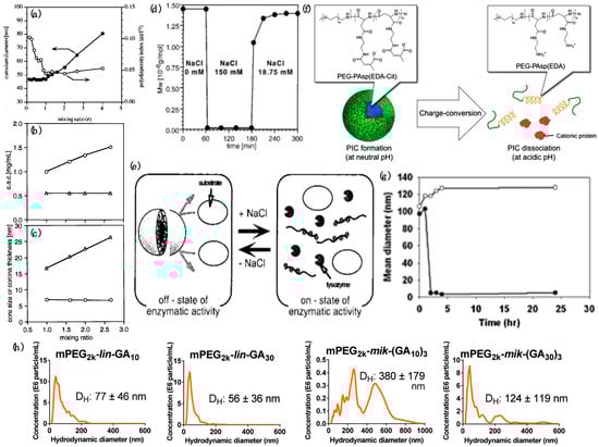 (a–c) various physical attributes of lysozyme/PEG-b-P(Asp) micelles varying with mixing ratio r at lysozyme concentration 2.0 mg/mL. (a) cumulant diameter (filled circles) and the polydispersity index (open circles); (b) critical association concentration (c.a.c.) (circles: c.a.c. of total concentration (lysozyme + P(Asp) + PEG); triangles: c.a.c. converted to the concentration of charged segments (lysozyme+P(Asp)); (c) core size (circles) and corona thickness (triangles) all changing with the mixing ratio r. (a) reprinted with permission from Ref. []. Copyright 1999 American Chemical Society. (b,c) adapted with permission from Ref. []. Copyright 1998 American Chemical Society; (d) fast and reversible dissociation and formation of protein–PE micelles upon exposure to high and low NaCl concentrations, respectively; (e) schematic illustration of the concomitant regulation of enzymatic activity of lysozymes upon incorporation and release from micelles; (d,e) adapted with permission from Ref. []. Copyright 1999 American Chemical Society; (f) schematic illustration of the stable micelle comprising PEG-b-pAsp(EDA-Cit) at neutral pH and the charge-conversion of block copolymer leading to micellar dissociation along with protein release at acidic pH. Reprinted with permission from Ref. []; (g) size of the protein/bPE micelles of PEG-b-pAsp(EDA-Cit) varying with time. Reprinted with permission from []. Copyright 2007 American Chemical Society; (h) micelle size distribution of mPEG2k-lin-GA10, mPEG2k-lin-GA30, mPEG2k-mik-(GA10)3 and mPEG2k-mik-(GA30)3-derived complexes with lysozyme at charge ratio 1.0. Reproduced from Ref. [] by permission of the Royal Society of Chemistry.