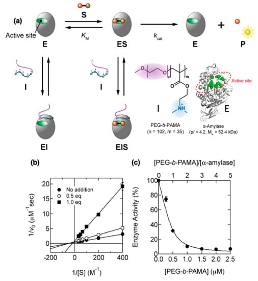 Specific interactions between the protein and the PE blocks can also influence the activity of the protein upon complexation and entrapment within the protein/bPE micelles. Complexation with PEG-b-P(Asp) was shown to accelerate the enzymatic activity of trypsin owing to the stabilization caused by hydrogen bonding between the imidazolium ion from the His residue in the catalytic site, the Asp-His-Ser triad, of trypsin with the Asp units in PEG-b-P(Asp) []. The extent of activity enhancement was found to be dependent on both size and concentration (relative to trypsin) of the PEG-P(Asp) chains. Furthermore, the amidase enzymatic reaction of trypsin accelerated upon micellization with poly(ethylene glycol)-b-poly(glutamic acid)) (PEG-b-PGA) and poly(ethylene glycol)-b-poly(methacrylic acid) (PEG-b-PMA) owing to formation of carboxylate/imidazolium pairs which enhanced the proton transfer process during the enzymatic reaction []. Conversely, complexation between cationic PEG-b-poly(N,N-dimethylaminoethyl)(PAMA) and anionic α-amylase [,,] led to bonding of the bPE on the α-amylase surface, leading to noncompetitive inhibition of enzyme activity (Figure 8a). The noncompetitive binding of bPE on the enzyme surface was confirmed through computer simulations. , estimated from Lineweaver–Burk plots (Figure 8b), for substrate hydrolysis by α-amylase was found to increase with increasing PEG-b-PAMA concentrations [], corresponding to weakening of the affinity between the enzyme and the substrate in the presence of noncompetitive bPE binding with the protein, leading to decreasing enzyme activity (Figure 8c).