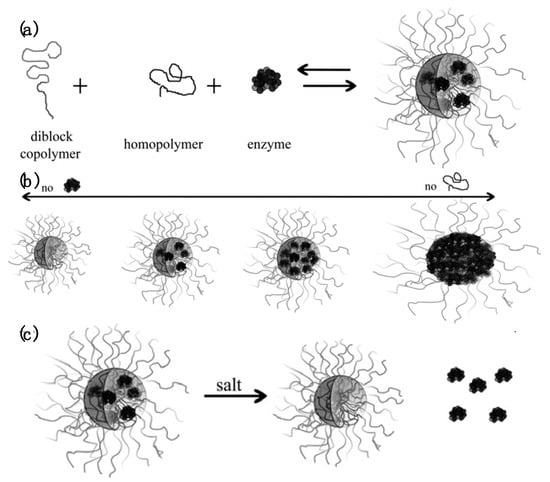 Schematics depicting (a) PEC micelle formation upon mixing of a charged diblock copolymer, an oppositely charged homopolymer and enzyme; (b) evolution of micelle morphology upon varying fraction of homopolymer and enzymes, and (c) release of enzyme from PEC micelles upon exposure to an external salt-jump stimulus. Reprinted with permission from Ref. []. Dissertation No. 4672, Library of Wageningen University.