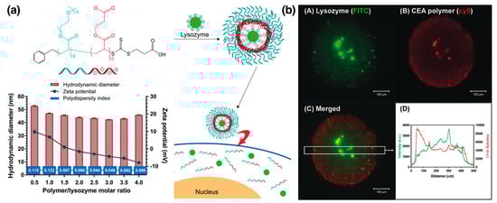 (a) schematic depicting the lysozyme/bPE micelle formation and the lysozyme cargos releasing into the cells. Also shown are the hydrodynamic sizes, zeta potentials and size polydispersity of the lysozyme/bPE micelles at various bPE/lysozyme ratios; (b) analysis of penetration ability of crosslinked lysozyme/bPE micelles in multicellular tumor spheroids using light-sheet microscopy. (A) FITC-labelled lysozyme (green), (B) Cy5-labelled CEA polymers (red), (C) Overlay of (A) and (B) showing respective distributions of polymers and lysozymes (D) Fluorescence intensity showing the relative distribution of polymer and lysozyme in the area marked with white box in (C). Adapted from Ref. [] with permission from the Royal Society of Chemistry.