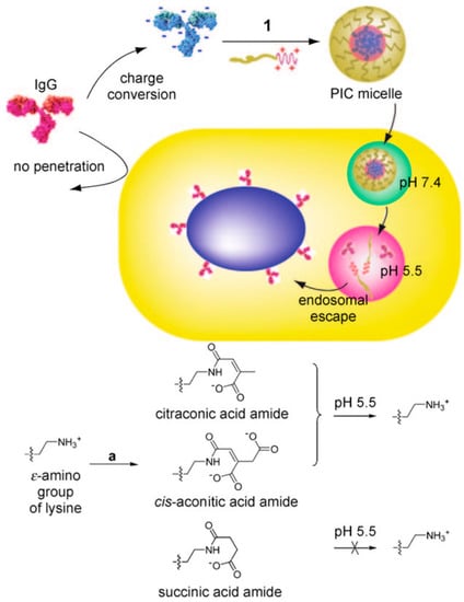 - Lee, Y.; Ishii, T.; Cabral, H.; Kim, H.J.; Seo, J.-H.H.; Nishiyama, N.; Oshima, H.; Osada, K.; Kataoka, K. Charge-conversional polyionic complex micelles-efficient nanocarriers for protein delivery into cytoplasm. Angew. Chem. Int. Ed. 2009, 48, 5309–5312. [Google Scholar] [CrossRef] [PubMed]