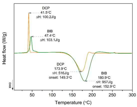 Aiming to choose the best processing temperature, DSC analysis was conducted. DSC curves of DCP and BIB peroxides are shown in Figure 1. The melting and decomposition temperatures and melting and decomposition enthalpies of the peroxides were monitored at first heating scan. The main parameter of temperatures Tm, Tonset and Tdecomp. of DCP were 41.5 °C, 149 °C and 174 °C, respectively. In the case of BIB peroxide, the temperature parameters were significantly higher, Tm, Tonset and Tdecomp. were equal to 47.4 °C, 153 °C and 181 °C, respectively. Results of DSC analysis allowed to define the temperature of reactive processing for the reactive modification of PCL via free radical reaction initiated by organic peroxide.