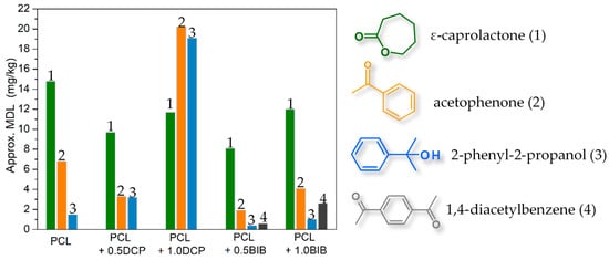In order to determine the volatile organic compounds (VOCs) emission from the samples, the static headspace and gas chromatography–mass spectrometry analysis was performed. The results are displayed in Figure 2. The VOCs measurements revealed that ε-caprolactone, acetophenone and 2-phenyl-2-propanol were the main volatile organic compounds (VOCs) for all PCL samples, and additionally 1,4-diacetylbenzene for PCL plus BIB. The growth in the VOC amount was related to by-products of peroxides decomposition and low molecular products of free radical reactions, e.g., acetophenone, methane or 2-phenylo-2-propanolfrom DCP and diacetylobenzene, tert-butanol, acetone or di-(2-hydroxyisopropyl)benzene in case of BIB, as it was mentioned above (Scheme 1). In the case of PCL modified by BIB peroxide, the amount of the VOCs was lower than for PCL samples with added DCP. It is related to the reactivity of used peroxides. The modification of PCL in the presence of BIB occurs more dynamically, and just after the adding of peroxide the emission of VOCs during reactive processing occurs.