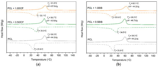 DSC thermograms for PCL modified by DCP (a) and PCL modified by BIB (b).