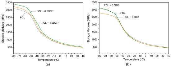 Storage Modulus for PCL modified by DCP (a) and PCL modified by BIB (b).