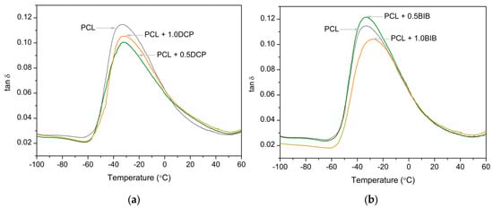 Loss angle (tanδ) for PCL modified by DCP (a) and PCL modified by BIB (b).