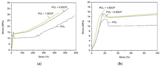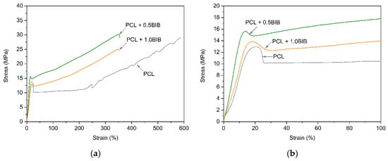 Results of the tensile strength, elongation at break, and hardness of studied PCL are listed in Table 4. An apparent yielding is evident in the stress–strain curves of all of the PCL modified by DCP and modified by BIB shown in Figure 7 and Figure 8, respectively. As it can be observed, the tensile strength of PCL modified by DCP and 0.5 pbw of BIB noticeably increased, while the elongation at break significantly decreased for those samples. It confirms that free radicals enhance interactions between PCL chains, toward branching or cross-linking.
