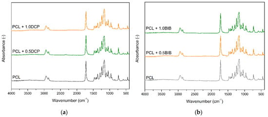 The Fourier-transform infrared (FTIR) technique is used to identify the structural modification taking place during the chemical reactions among PCL in the presence of DCP and BIB, as presented in Figure 9a,b, respectively. FTIR was applied to investigate the chemical structure of neat PCL and PCL modified by organic peroxides. Figure 9 shows the absorption spectra of PCL and modified PCL in the total wavelength range of 4000–400 cm−1. Regarding the spectra of PCL samples, we can easily identify two peaks at 2942 and 2863 cm–1 which indicated the presence of C-H stretching, strong bands such as the carbonyl stretching mode and C-O bending around 1722 cm−1 and 1140 cm–1 [57]. The characteristic strongest bands and their assignments with all of the PCL samples are listed in Table 5. Introduction of a small amount of organic peroxides to the PCL matrix did not demonstrate significant changes in the structure, which we can observe by using FTIR spectroscopy.