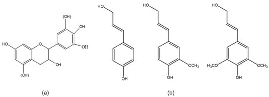 Polypropylene (PP) is a typical semi-crystalline thermoplastic derived from the olefin monomer propylene. Since being discovered in 1954, PP has quickly become one of the most popular commodity plastics due to its low density and low cost with good mechanical property []. Today, PP is widely used as a composite matrix to process composite materials because of the excellent chemical resistance; hence, it can be easily processed by many efficient converting methods, like injection molding and extrusion []. The combination of PP with polymers from sustainable resources has been extensively studied over the past decades in order to reduce the dependence on petrochemical-based plastics []. Generally, composite materials based on PP and biopolymers have a lower lightweight and less environment impact []. Apart from these major advantages, biopolymers bear individual structural features associated with specific properties; hence, they are potential functional elements for PP. For example, cellulose is generally used as a reinforcement of PP []; starch and polylactic acid can improve the degradability of PP []; carbohydrates, proteins, lipids, and phenolic compounds can be flame retardants of PP []. Among these biopolymers, phenolic compounds (e.g., lignin and tannin) incorporated with PP have attracted interest for both academia and industry, because PP is highly sensitive to UV light and oxygen compared with other polyolefins, while phenolic compounds can prevent its thermo- and photo-degradation, owing to their chemical structure. As shown in Figure 1, flavonoid structure of tannin (Figure 1a) [] and the phenylpropanoid (C9) units of lignin (Figure 1b) [] are inherent hindered phenolic structures, which can stabilize themselves into stable phenoxy radicals, preventing initiation of new radicals [].