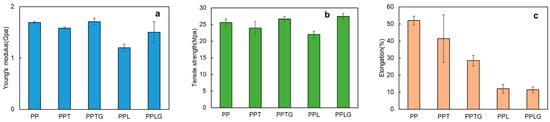 The tensile test results of PP/tannin blend (PPT), PP/tannin-glyoxal blend (PPTG), PP/lignin blend (L), and PP/lignin-glyoxal blend (PPLG) are shown in Figure 2. As can be seen from the bar chart, a clear decrease of Young’s moduli can be found for PPT and especially for PPL. However, PPTG and PPLG display a general increasing trend compared with PPT and PPL. Young’s modulus is the stiffness of material at the elastic stage of a tensile test. For thermoplastic composite materials, this property can be readily improved by adding rigid fillers because the rigidity of fillers is generally much higher than that of PP matrix []. Therefore, a further crosslinked process happens to both pre-reacted tannin and lignin during extrusion process producing rigid fillers. This can explain the improvement of Young’s moduli.