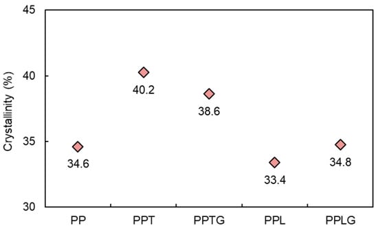 The addition of filler commonly affects the crystallinity of the polymer matrix, especially in PP, a semi-crystalline polymer. Figure 4 presents the crystallinity of PP/polyphenol blends (PPT, PPL), and PP/crosslinked polyphenol blends (PPTG, PPLG). Various fillers [,,], including thermoset resin [], have been reported to provide positive effects on the crystallinity of PP. Similar results can be found in our recent publication regarding tannin-hexamine thermoset particle-filled PP []. In this study, both PPT and PPTG present higher crystallinity compared with PP. This result is in accordance with the improvement of tensile properties previously observed (Figure 2). The higher crystallinity of PPT compared to PPTG can be rationalized by the smaller particle sizes of the non-cross-linked tannins observed in SEM images (Figure 3). In contrast with previous reports [], the addition of lignin reduced the crystallinity of PP matrix. This can be explained by the agglomeration of lignin particles previously observed. With reducing the hydrophilic property of lignin through the dynamic crosslinked process, the better particles dispersion resulted in an increase in the number of nucleating agents and a further increase in the crystallization rate of PP in the blends.
