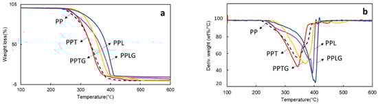The effects of native and crosslinked tannin/lignin on the thermal behavior of the PP matrix were determined by thermogravimetric analyses in an air atmosphere. Their weight loss as a function of temperature and derivative thermo-gravimetric (DTG) data are plotted in Figure 5. All samples degraded in a one-step process, from 220 to 410 °C, as can be concluded by the presence of only one peak in the DTG curves. Pure PP degraded completely without any char while the PP/polyphenol blends exhibited some char at 420 °C. This behavior leads to the formation of a protective surface shield and their interactions between PP, contributing to the considerable heat resistance []. However, PP/polyphenol blends represent noticeable differences in the thermo-gravimetric curves. The PP/lignin blends have a better heat resistance compared with PP/tannin blends. The different char forming capacity can be an explanation. According to the report of Sonnier [], the char yield of lignin was 57 wt % while that of tannin was generally 30 wt %. Another possible reason could be related to molecular weight differences. According to the published articles, the average molecular weight of mimosa tannin (molecular weight distribution ranged from 375 to 2333 Da []) was generally much lower than that of Kraft lignin (Mn = 6772 g/mol [], Mn = 5202 g/mol []). On this basis, the large molecular weight of lignin under thermo-degradation process results in the breakdown of linkages producing reactive and unstable lignin-derived fragments. These fragments may further react through rearrangement, electron abstraction, or radical–radical interactions, to effectively delay PP from degradation []. However, a similar thermo-degradation and interaction may occur in PPTG and PPLG blends, considering that un-crosslinked tannin/lignin existed because of their stereo-chemical structure and the limited resident time in the extruder (approximately 2 min 30 s). Besides, the pre-reaction of tannin and lignin were performed in alkaline condition (see Material and Methods section) [,], which resulted in linkage breakdown of polymers, increase in the phenolic content, and promotion of the antioxidant property []. The phenolics basic depolymerization could improve the radical capturing capacity of crosslinked tannin and lignin, resulting in better heat resistant of PPTG and PPLG.