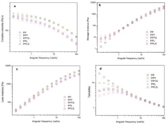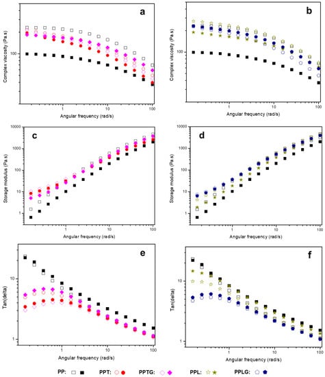 Figure 6b,c presents the storage moduli and loss moduli as a function of the frequency of all tested samples. From those figures, a generally higher value of loss moduli than that of storage moduli can be observed. For loss moduli, there is no significant difference in all samples, however, an increase of storage moduli can be found in all filled PP samples at low frequency, suggesting that the presence of both native and crosslinked tannin/lignin limits the mobility of polymer chain, reinforcing the internal network structure. However, both PPTG and PPLG have higher storage moduli compared with PPT and PPL; this confirms the formation of thermoset particles in the PP matrix. Figure 6d, tan (delta), which is defined as the ratio of loss moduli and storage moduli, is plotted as a function of angular frequency. The tan (delta) values of all tested samples are above 1 and this implies that they are viscous-like materials. With the addition of tannin or lignin, tan (delta) is clearly observed to be lower than PP in the low-frequency region. This suggests that the mobility of the polymer chains is limited by polyphenols; thus, those filled samples show more elastic behaviors. Particularly, it is worth noting that PPTG and PPLG present a lower tan(delta) compared with PPT and PPL, indicating that crosslinked tannin or lignin more significantly restrict the movement of PP polymer chain. This can be explained by the formation and better dispersion of rigid thermoset particle through the dynamic extrusion.