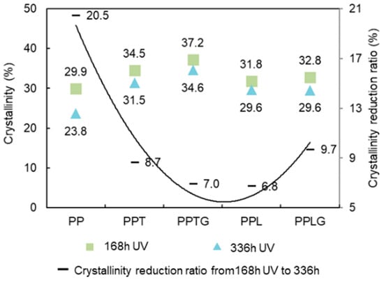Figure 9 displays the crystallinity of PP and PP/polyphenols blends over UV exposure. The reduction ratio of their crystallinities from 168 to 336 h is plotted as well. A drop in crystallinity can be observed after UV exposure in all samples because of the chain scission. More importantly, between 168 and 336 h of UV weathering, a decrease of crystallinity clearly was observed for neat PP (20.5%) compared to phenolic-based composites (<10%). Upon exposure to air and UV, photo-oxidation occurs by the appearance of free radicals. This oxidation is a circular, self-propagating process that, unless intruded on by an antioxidant, progressively leads to increasing the breaking and shortening of the polymer chain []. Therefore, the presence of tannin/lignin with the radical scavenge capacity inhibit chain scission of the polymer chain, reducing the decrease of crystallinity.