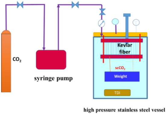 Kevlar 49 fibers were manufactured by Dupont Co. USA (Dupont, Midland, MI, USA). The yarn is made of 10,012 single filaments with a diameter of 12.7 μm and a specific linear density of 6320 dtex, density of 1.44 g/cm3. The carbon dioxide, toluene 2,4-diisocyanate (TDI), and acetone used in this study were purchased from Shanghai Chenggong Gases Co., Ltd. (Shanghai, China), J&K Chemical Ltd. (Shanghai, China), and Shanghai Ling Feng Chemical Reagent Co., Ltd. (Shanghai, China), respectively. These chemicals were used without further purification.